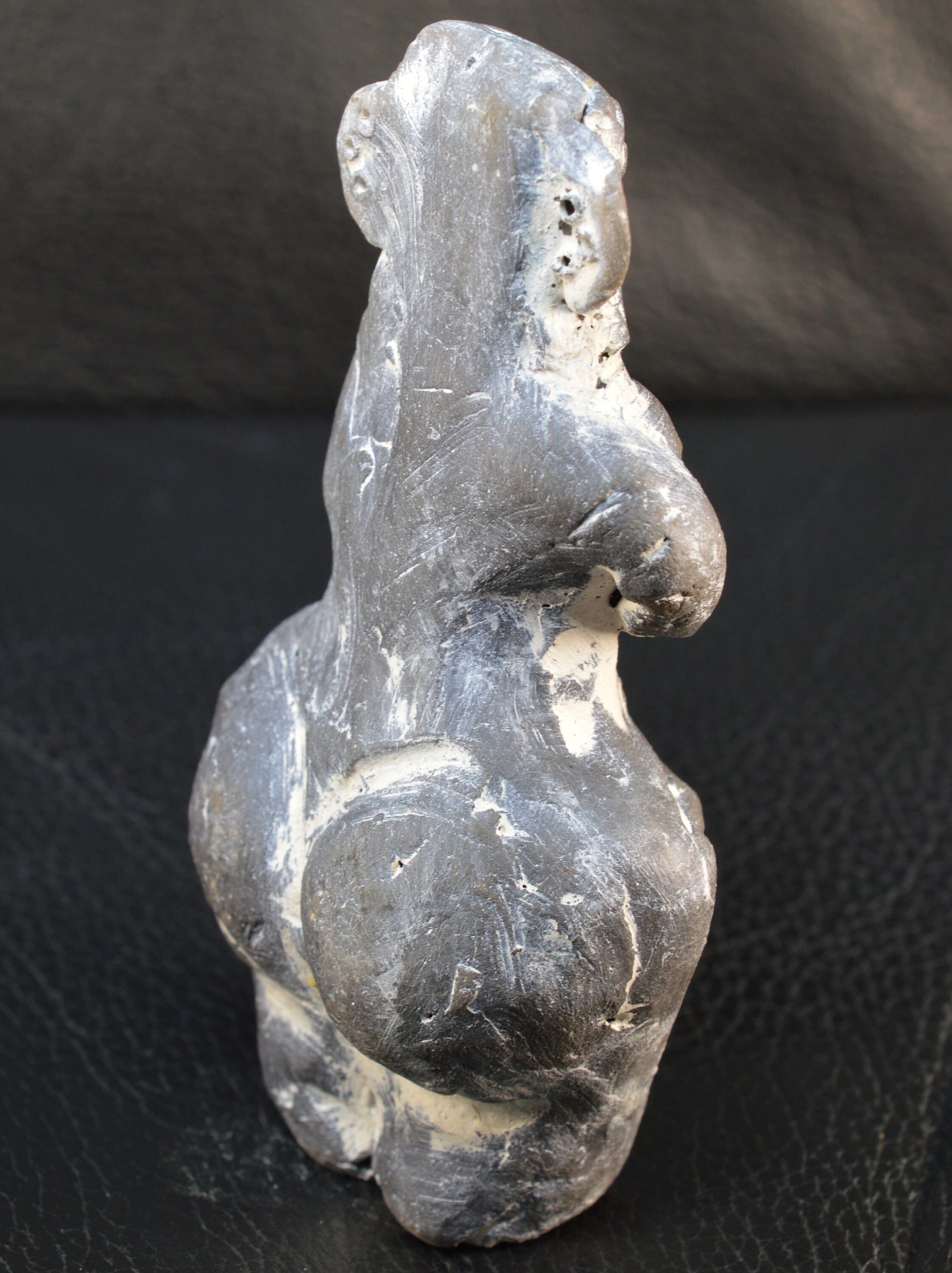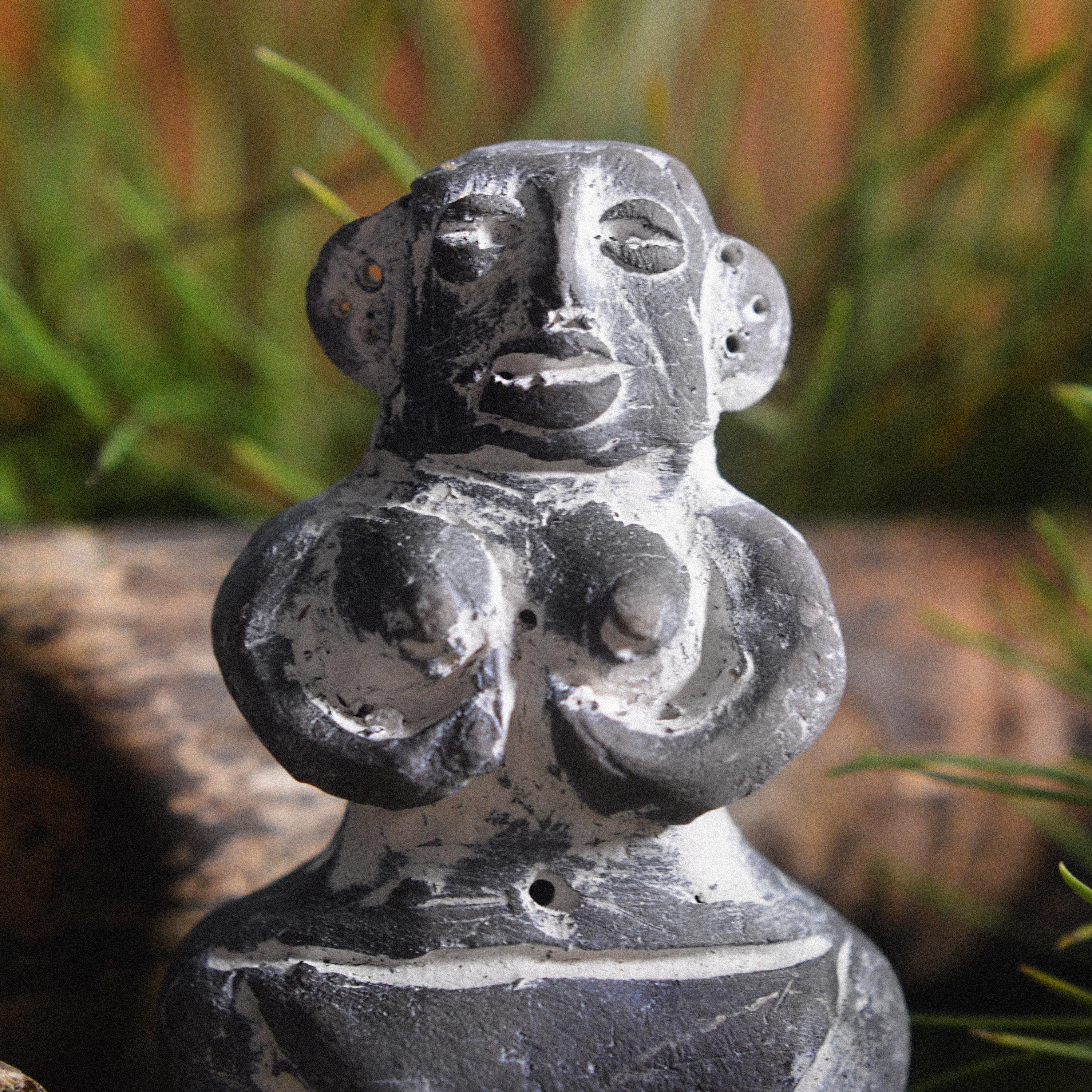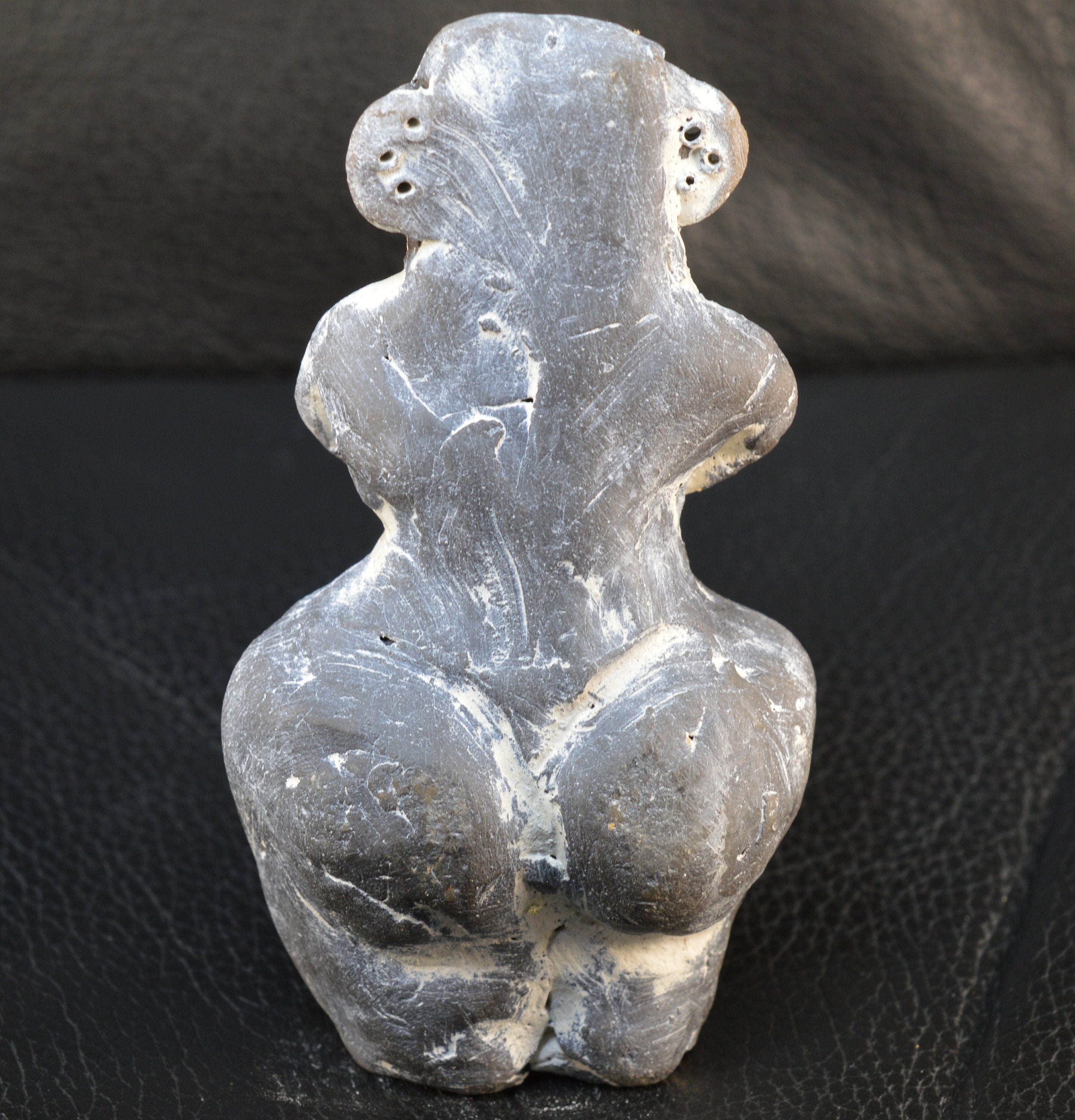 Handcrafted from clay, the figurine depicts a sitting, pregnant women with large belly and full hips. The female Goddess is believed to be a symbol of fertility and prolificacy.