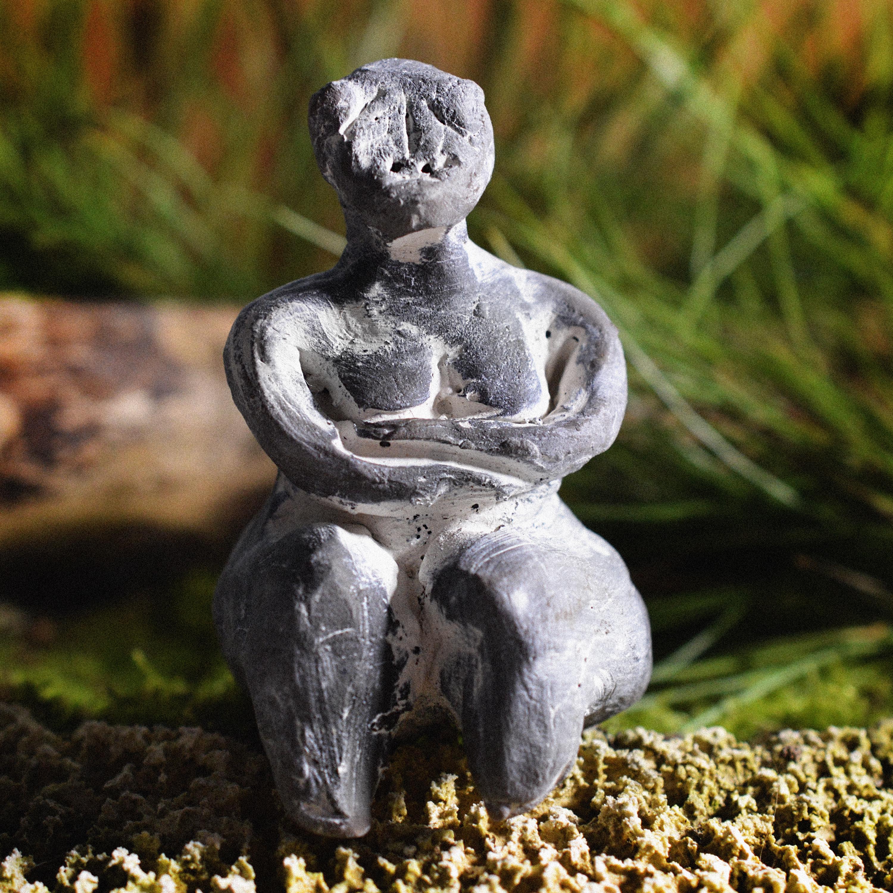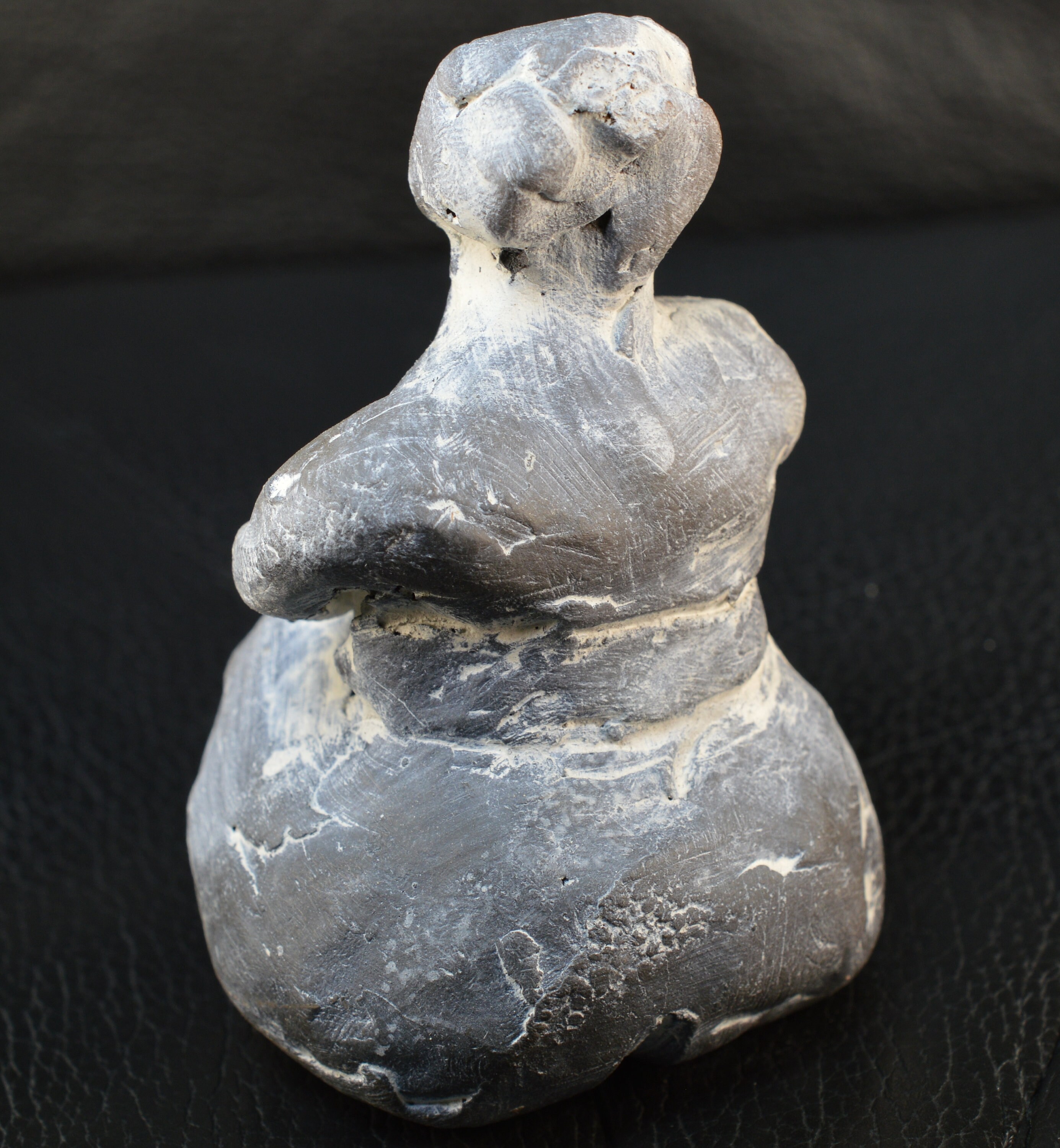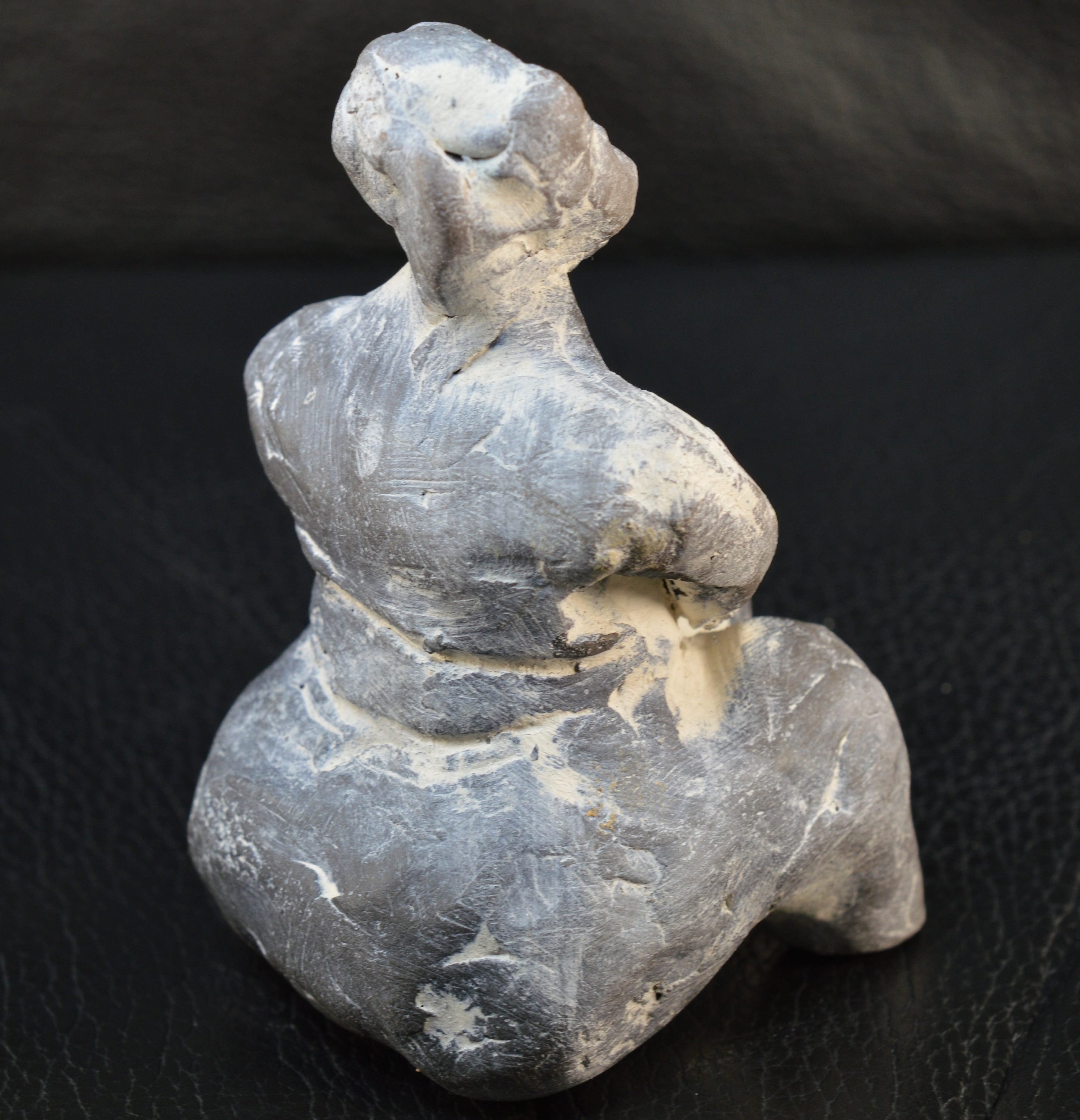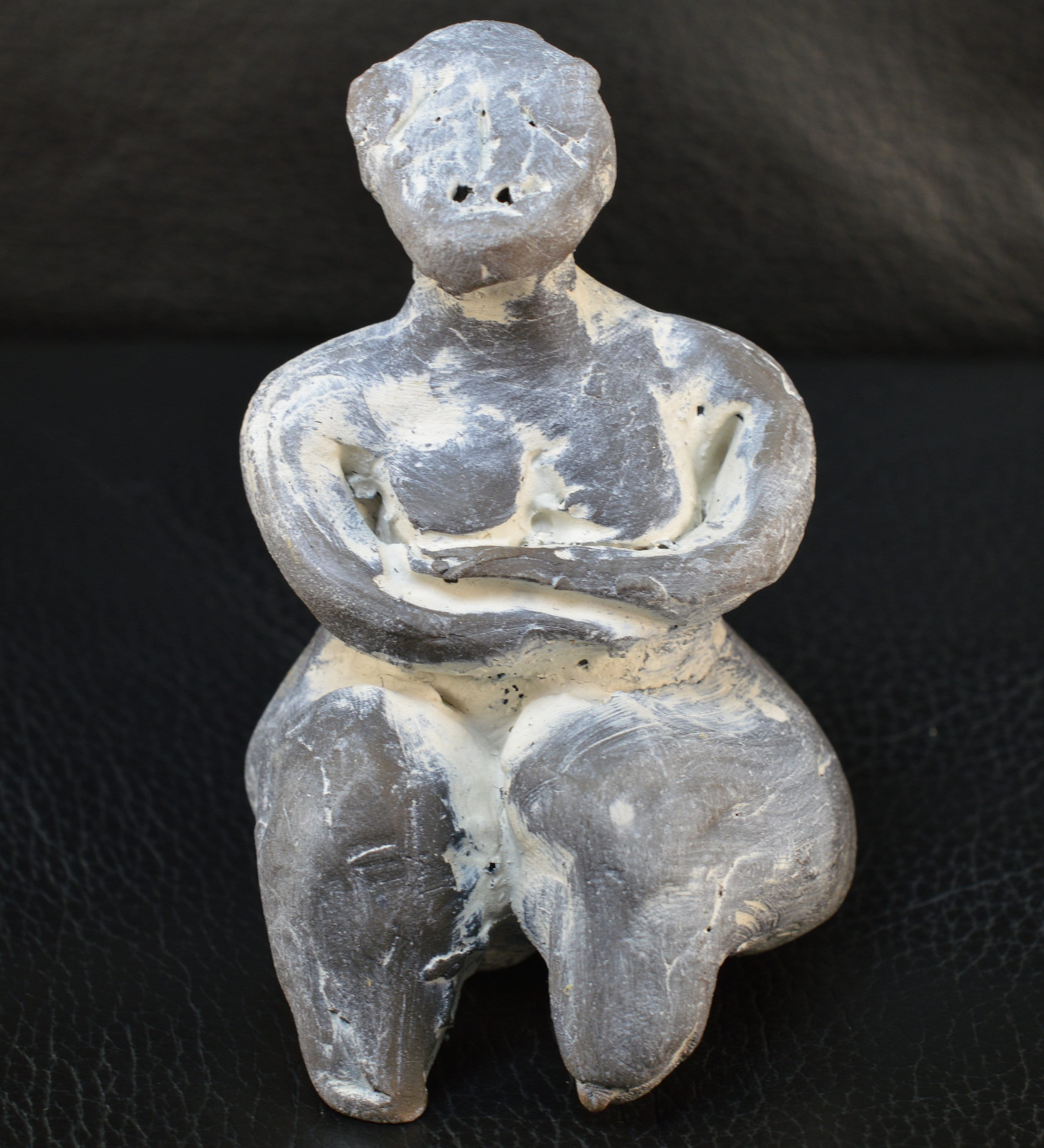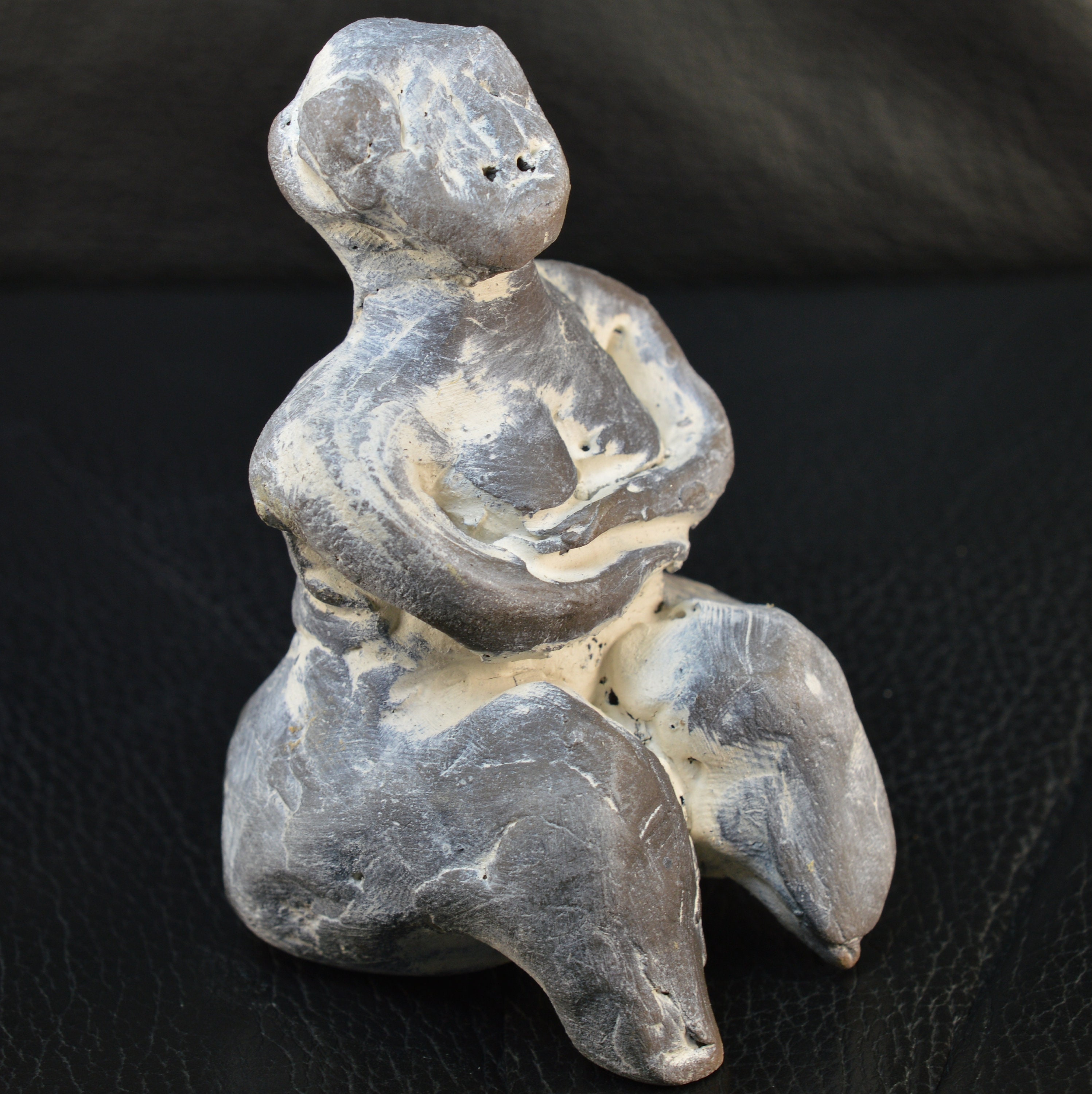 Handcrafted from clay, the figurine depicts a sitting, pregnant women with large belly and full hips. The female Goddess is believed to be a symbol of fertility and prolificacy.