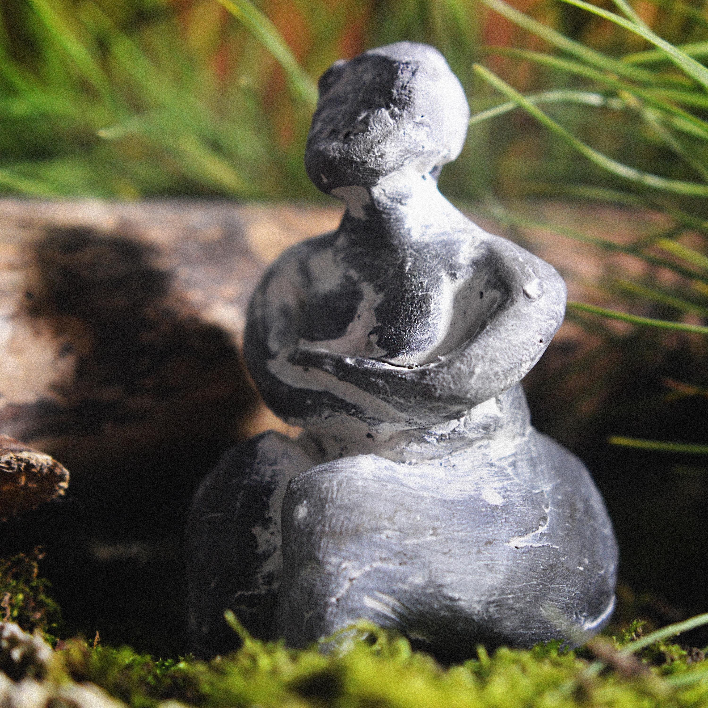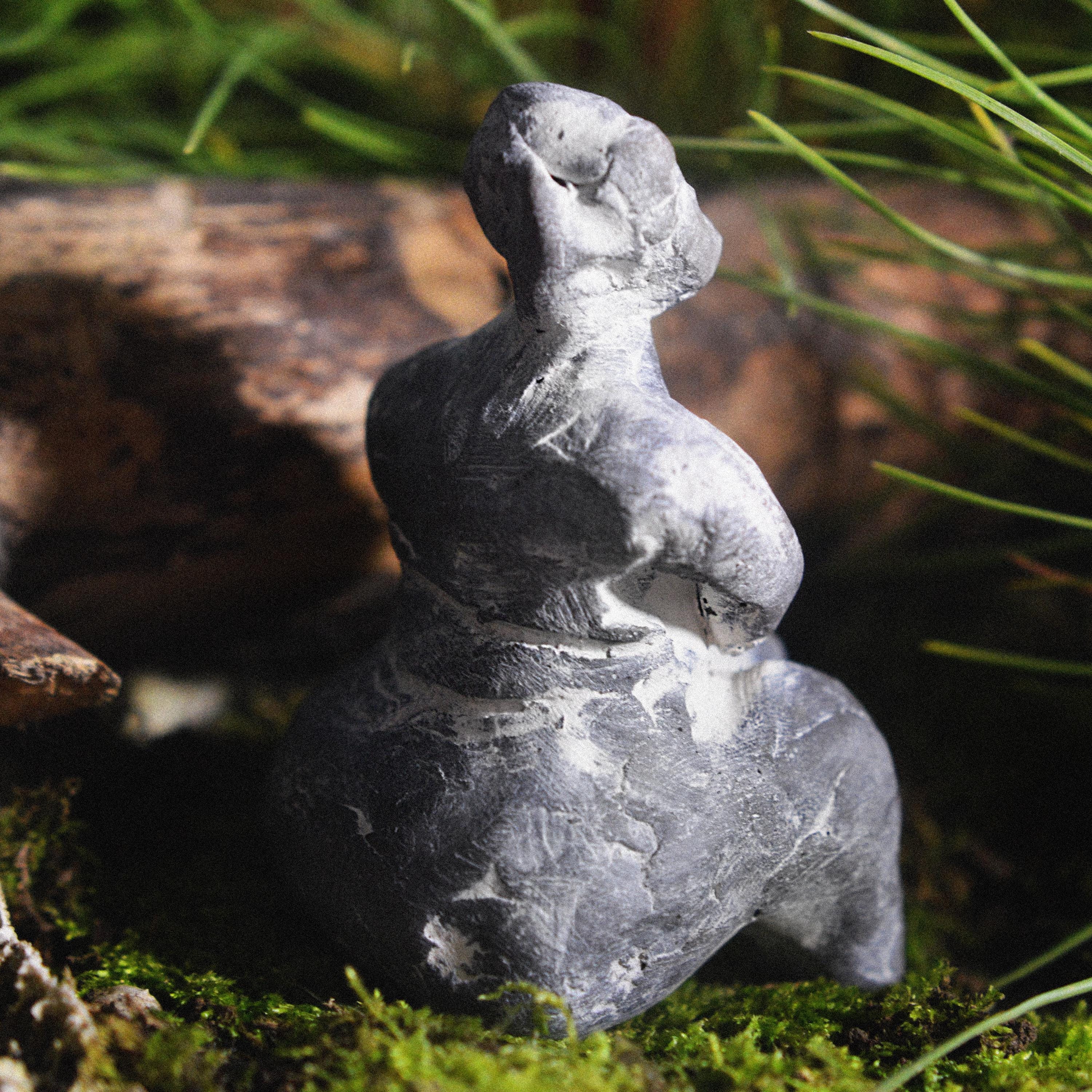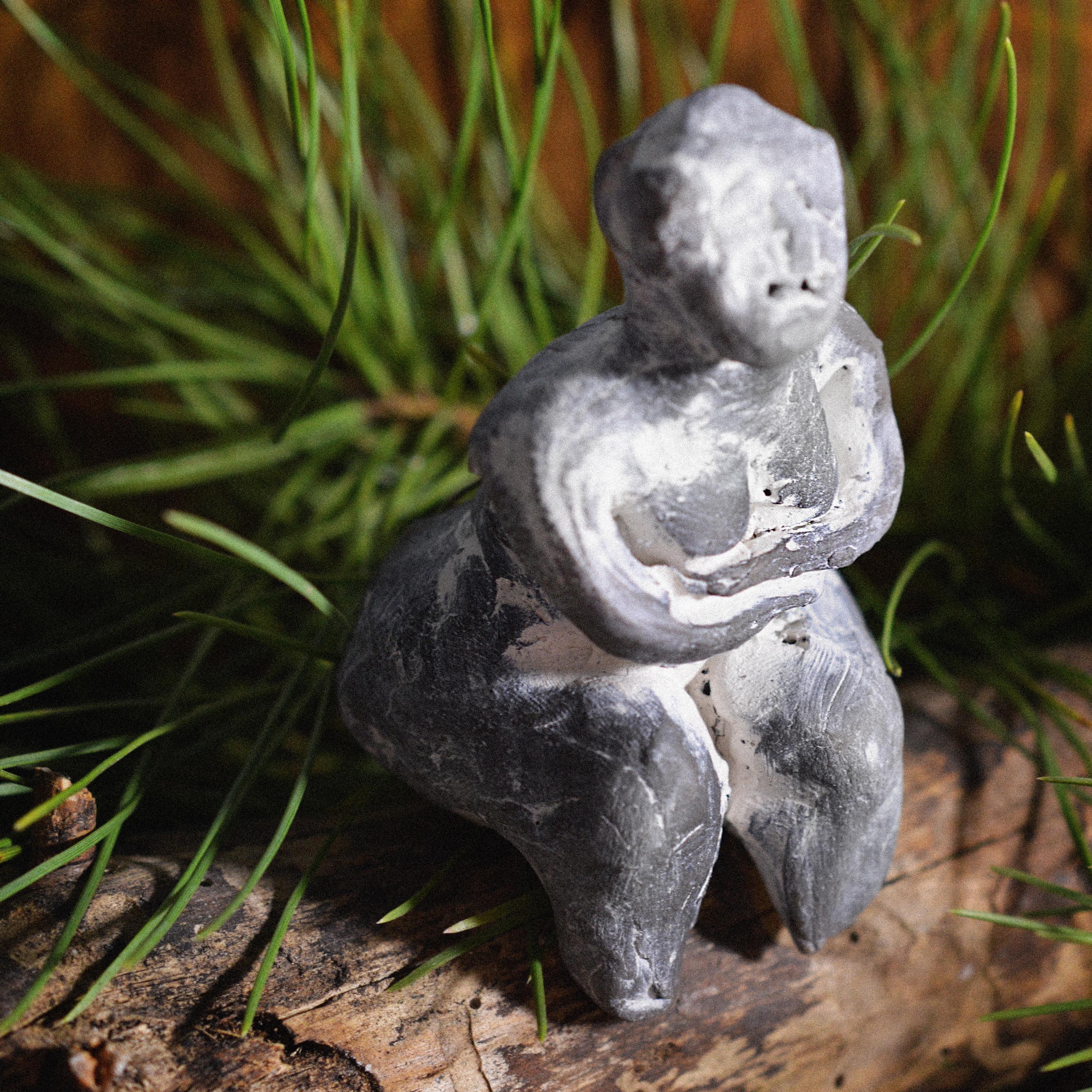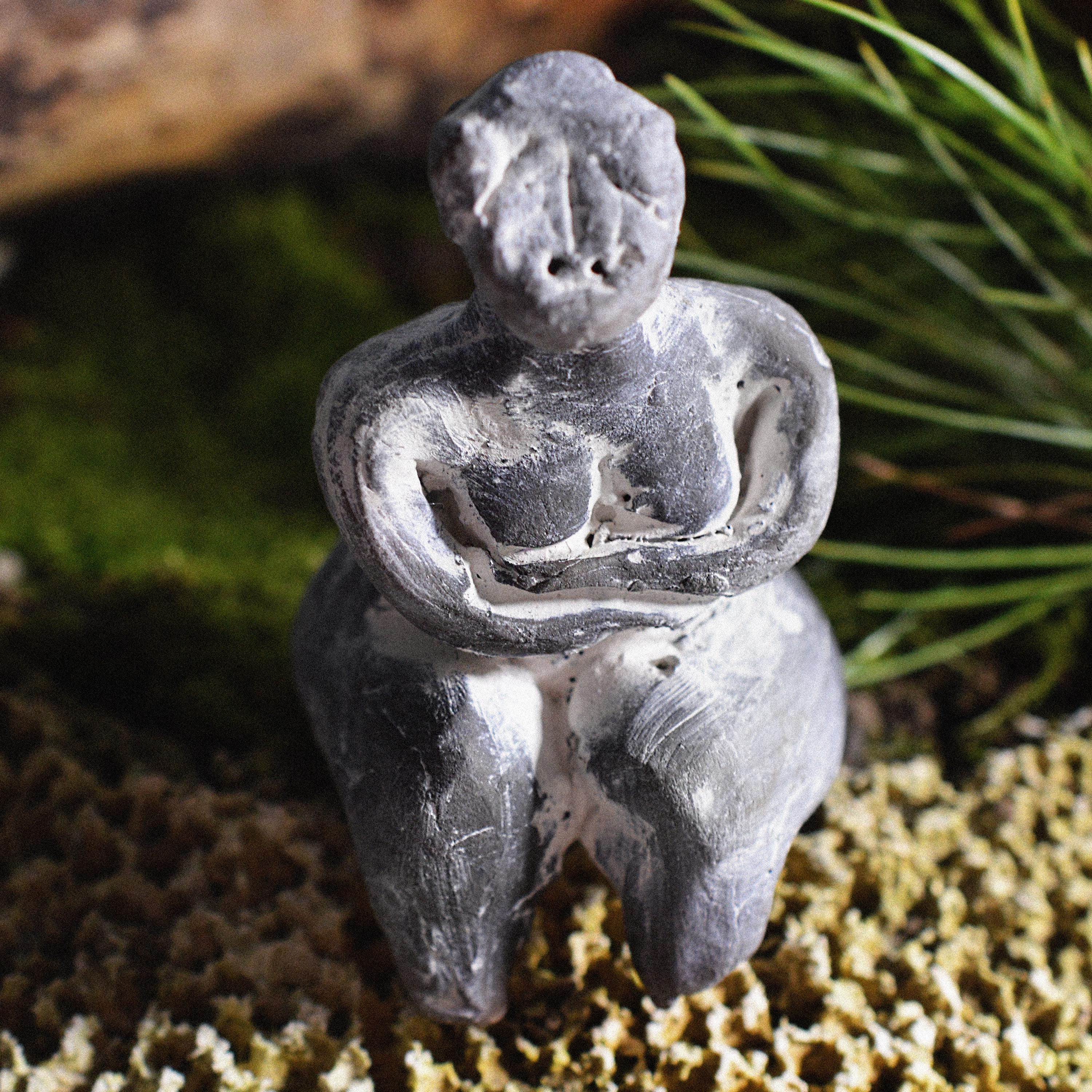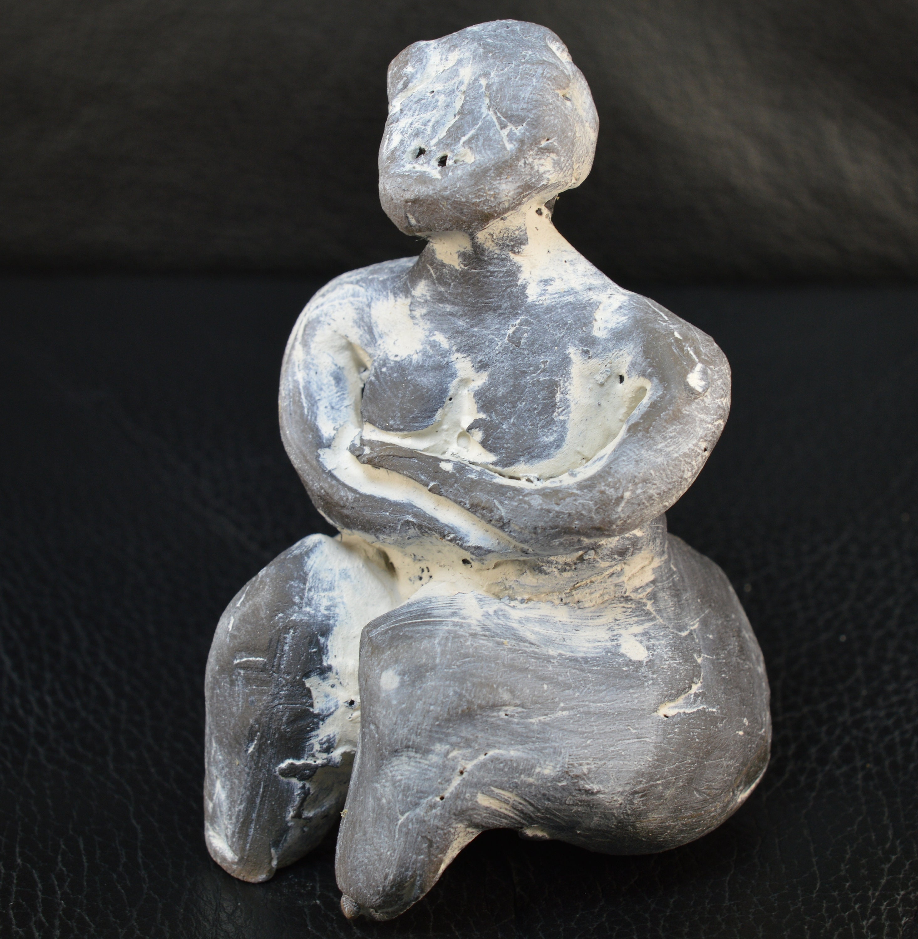 Handcrafted from clay, the figurine depicts a sitting, pregnant women with large belly and full hips. The female Goddess is believed to be a symbol of fertility and prolificacy.