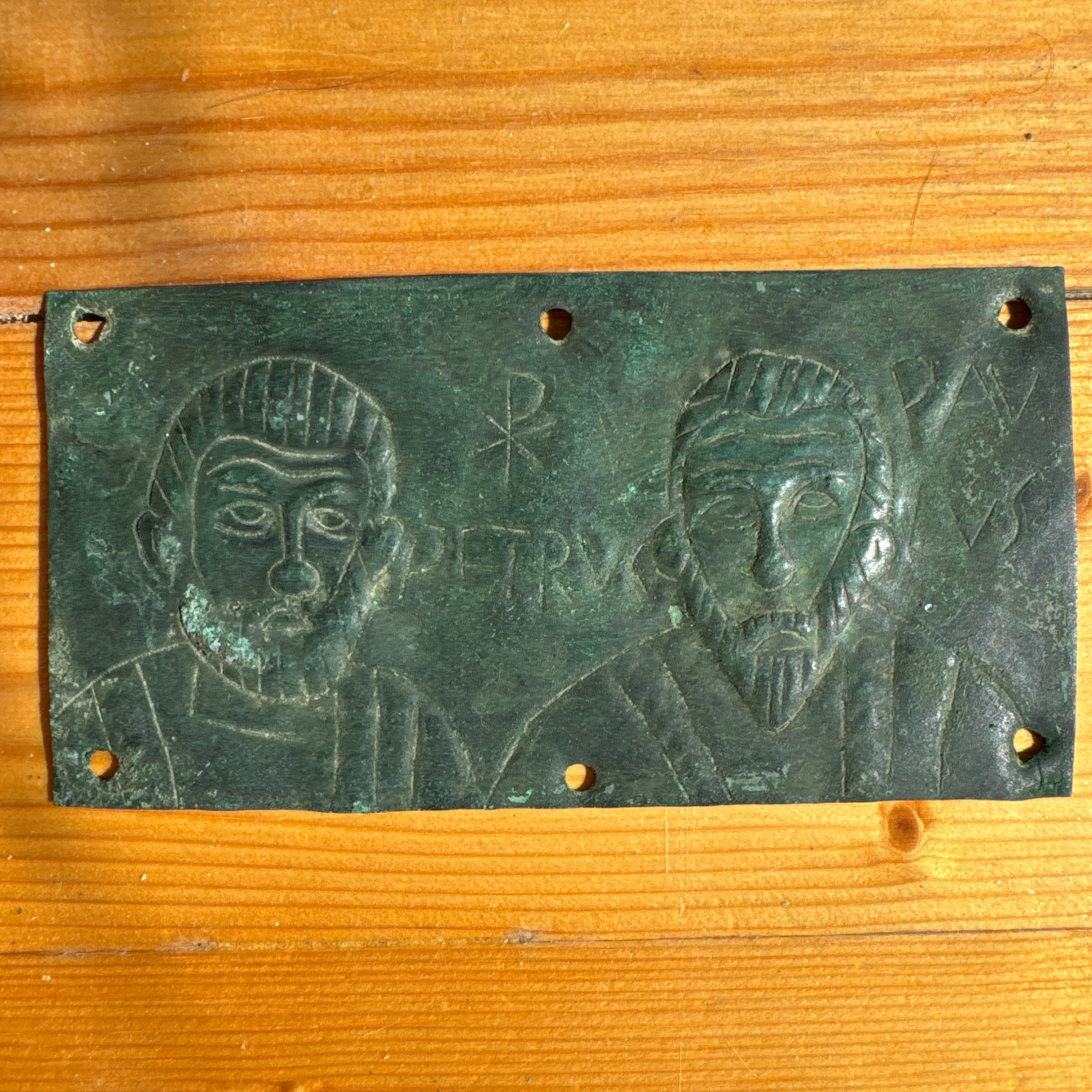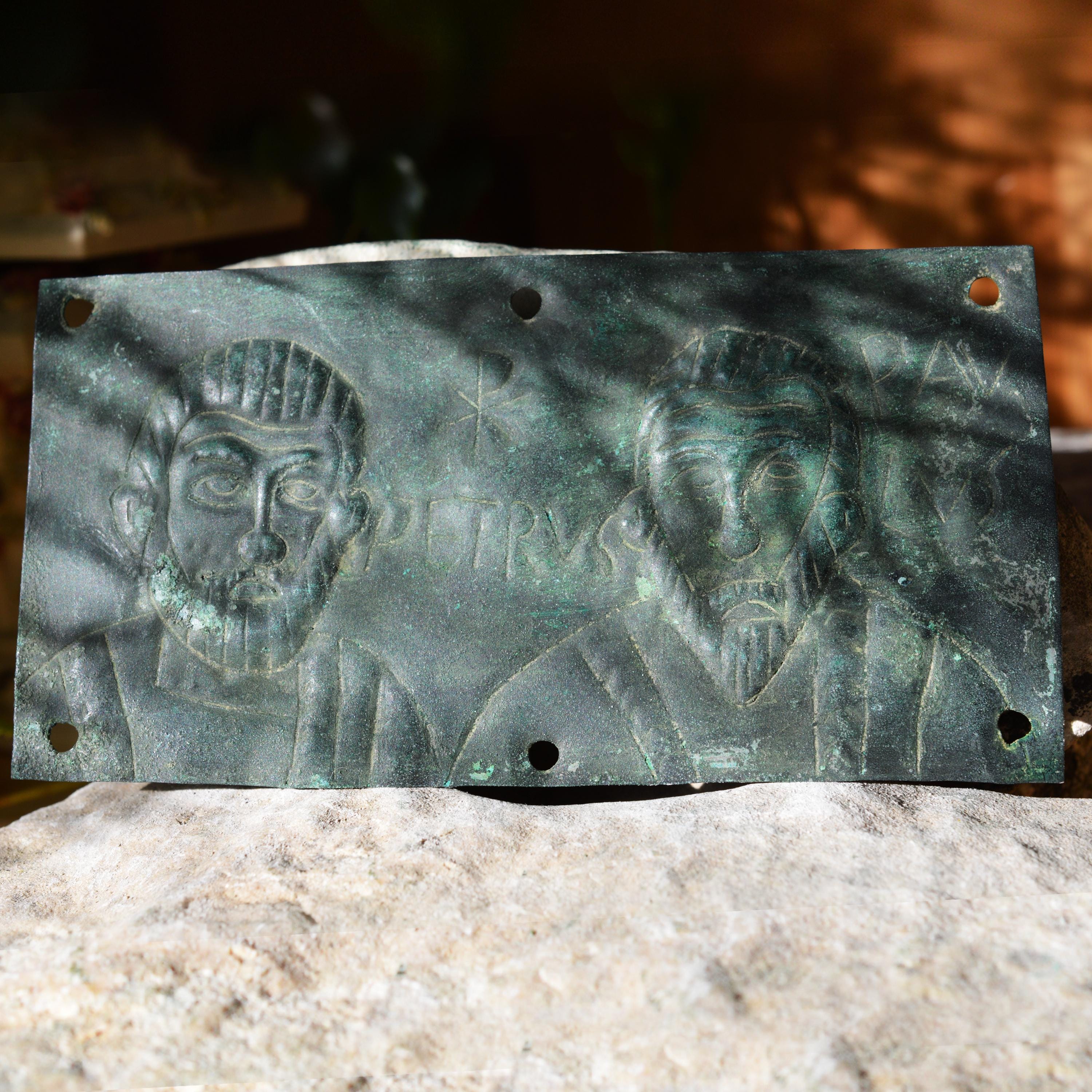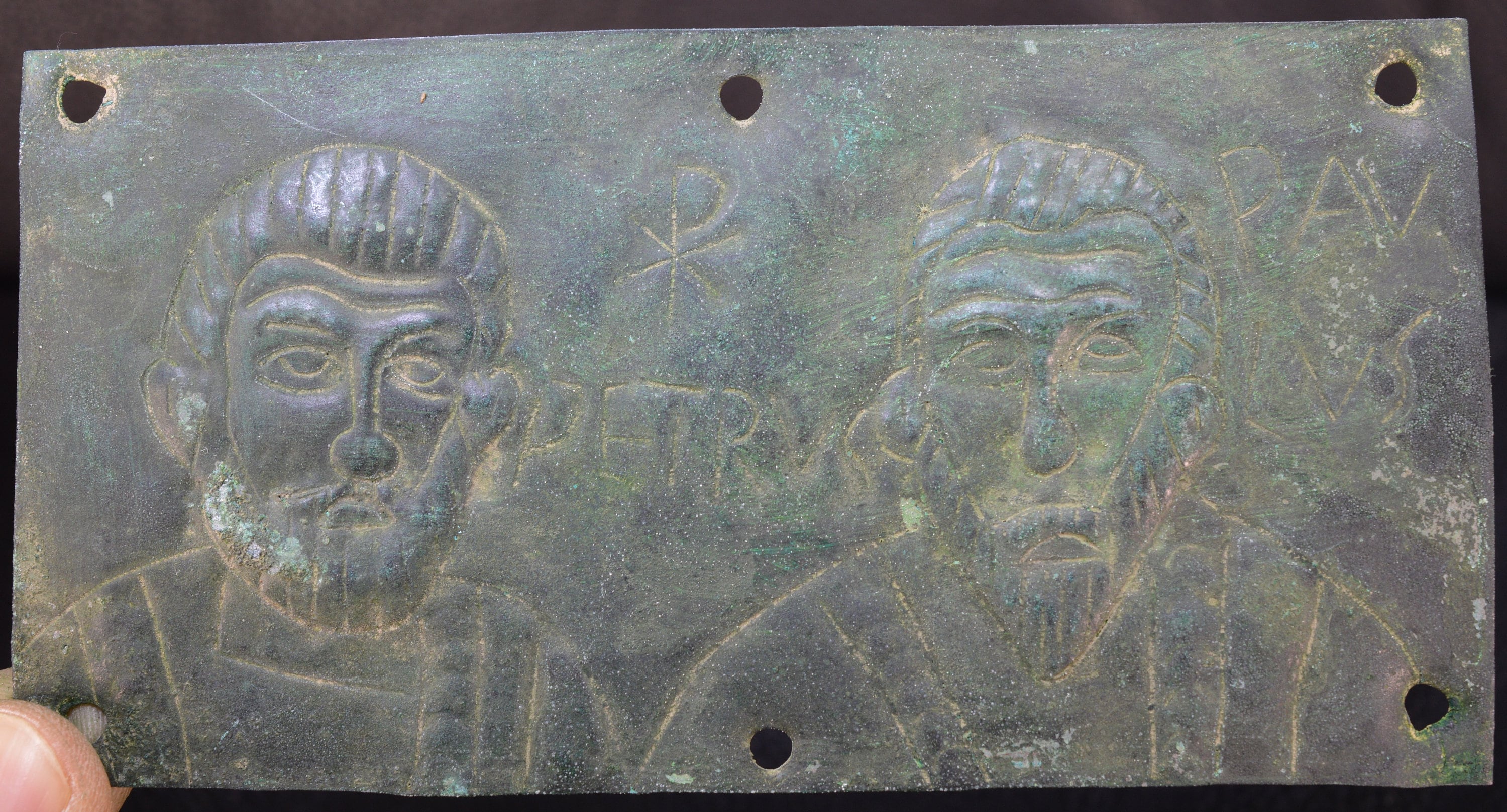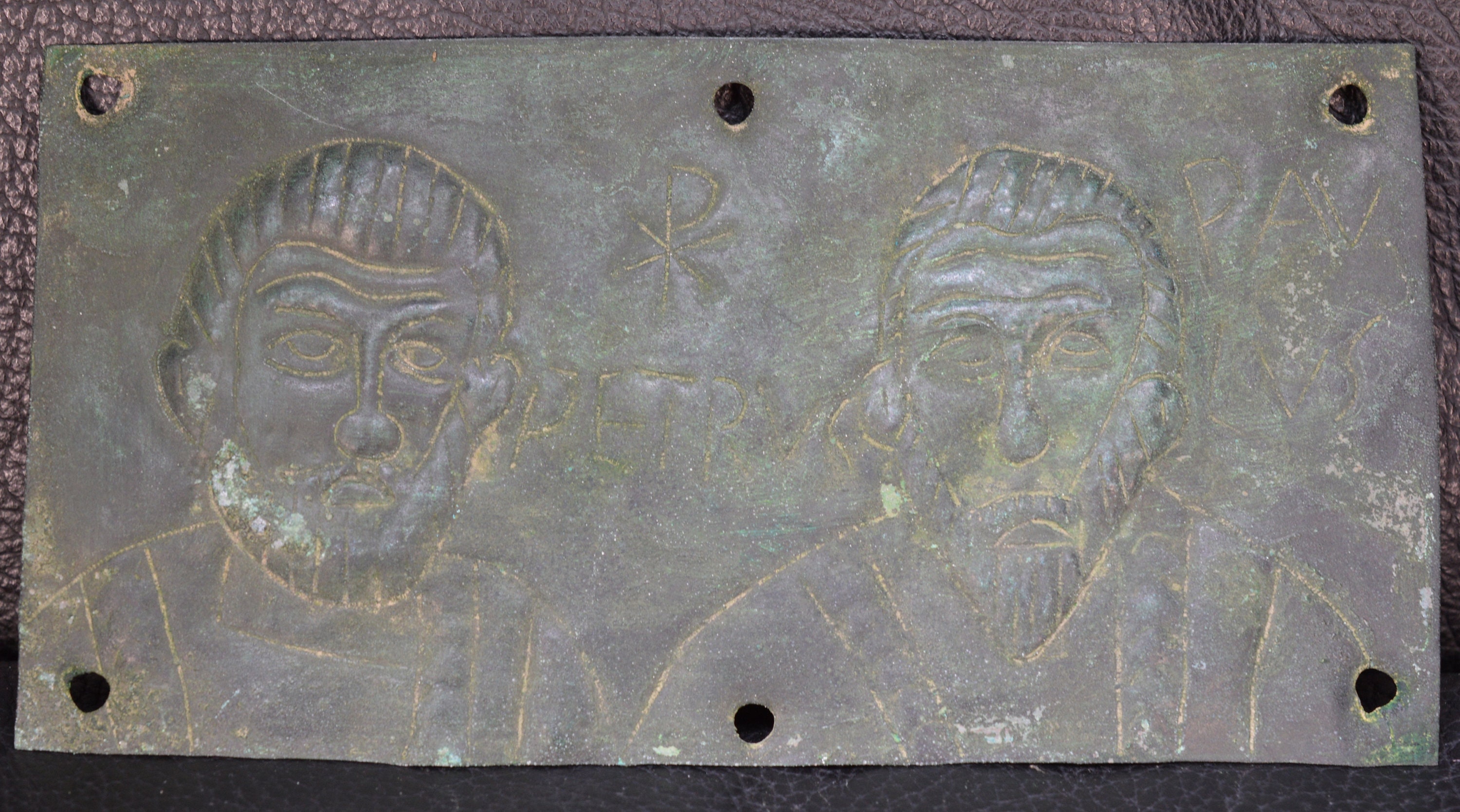 Byzantine Bronze Icon Attachment PETRVS & PAVLVS, Chi-Rho Symbol
