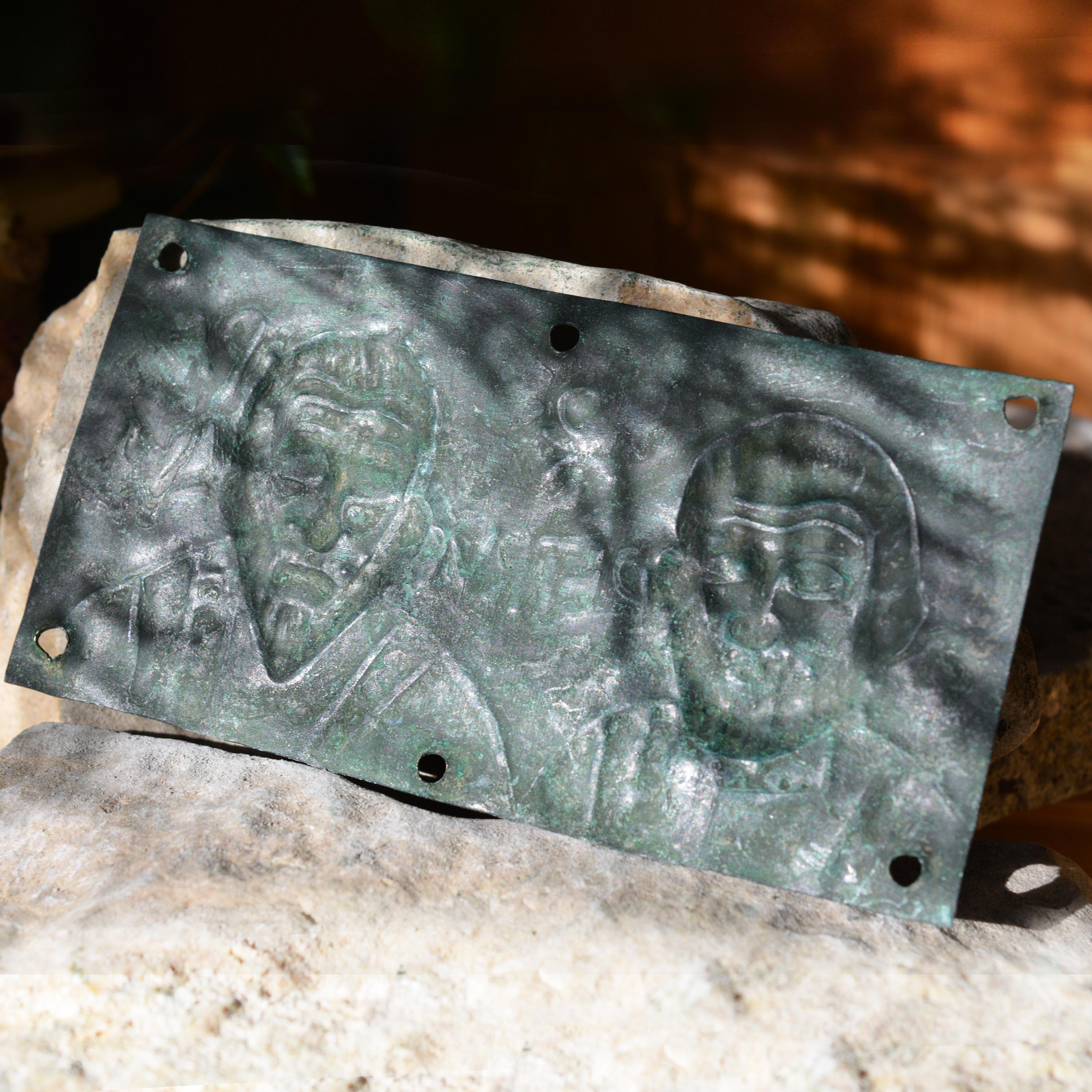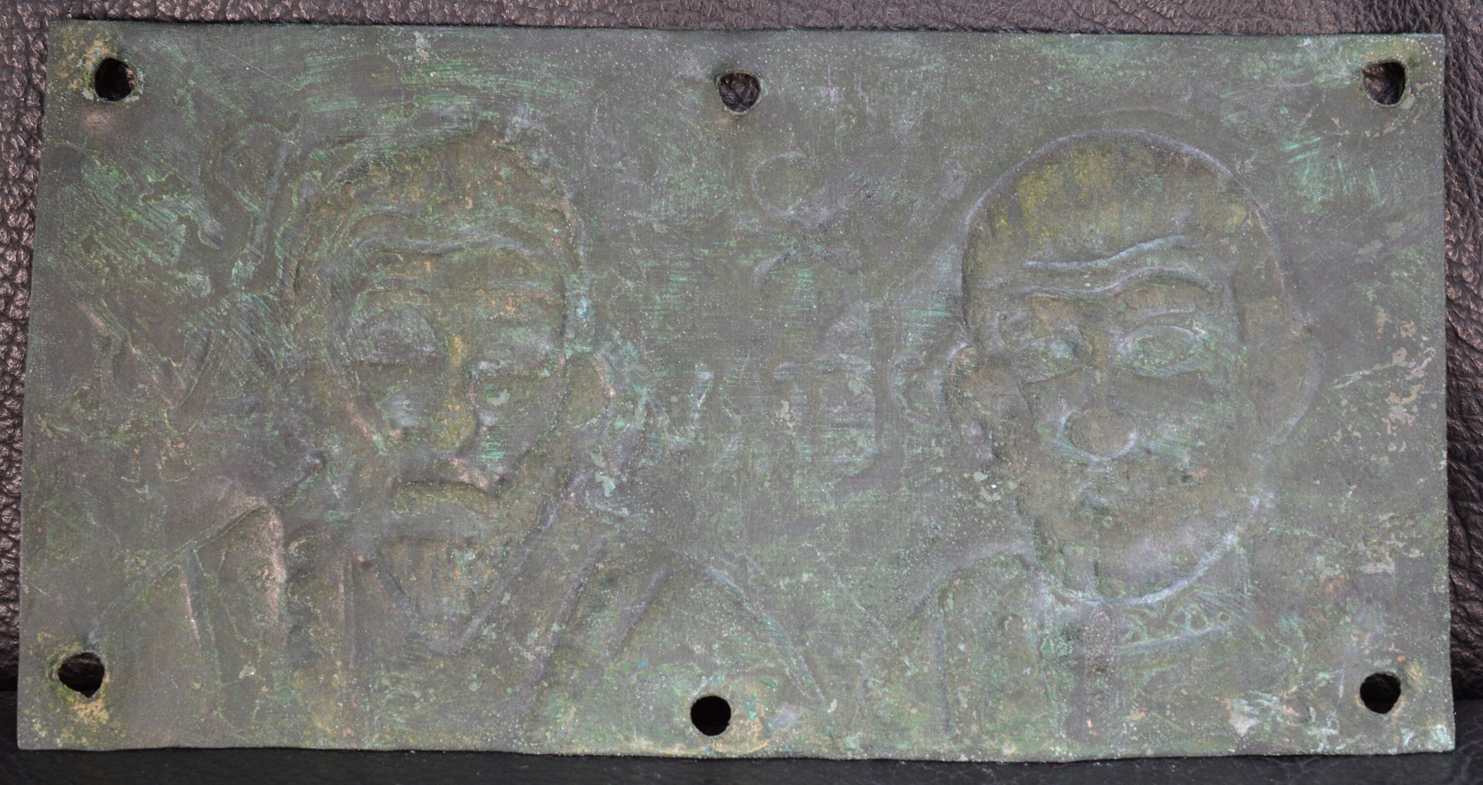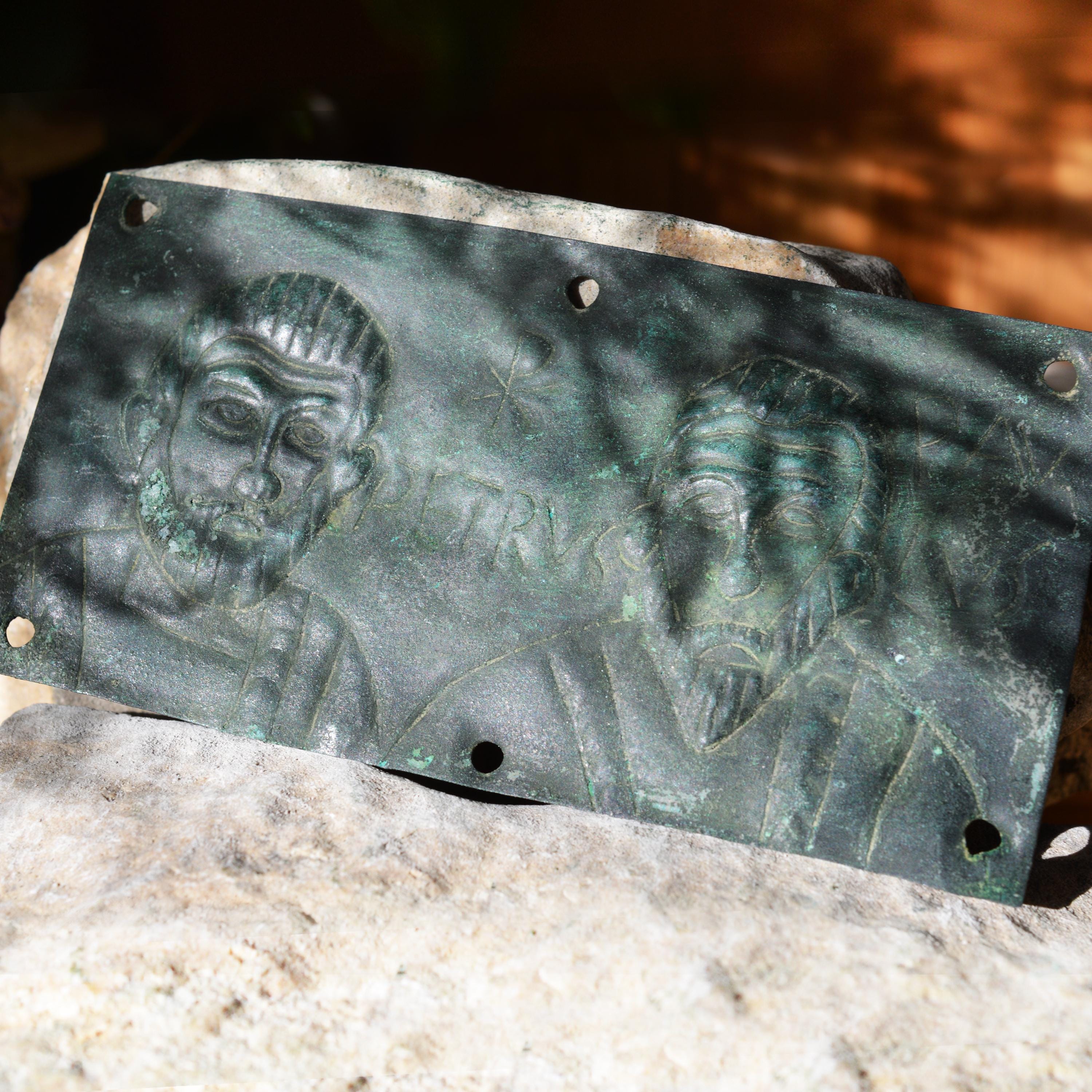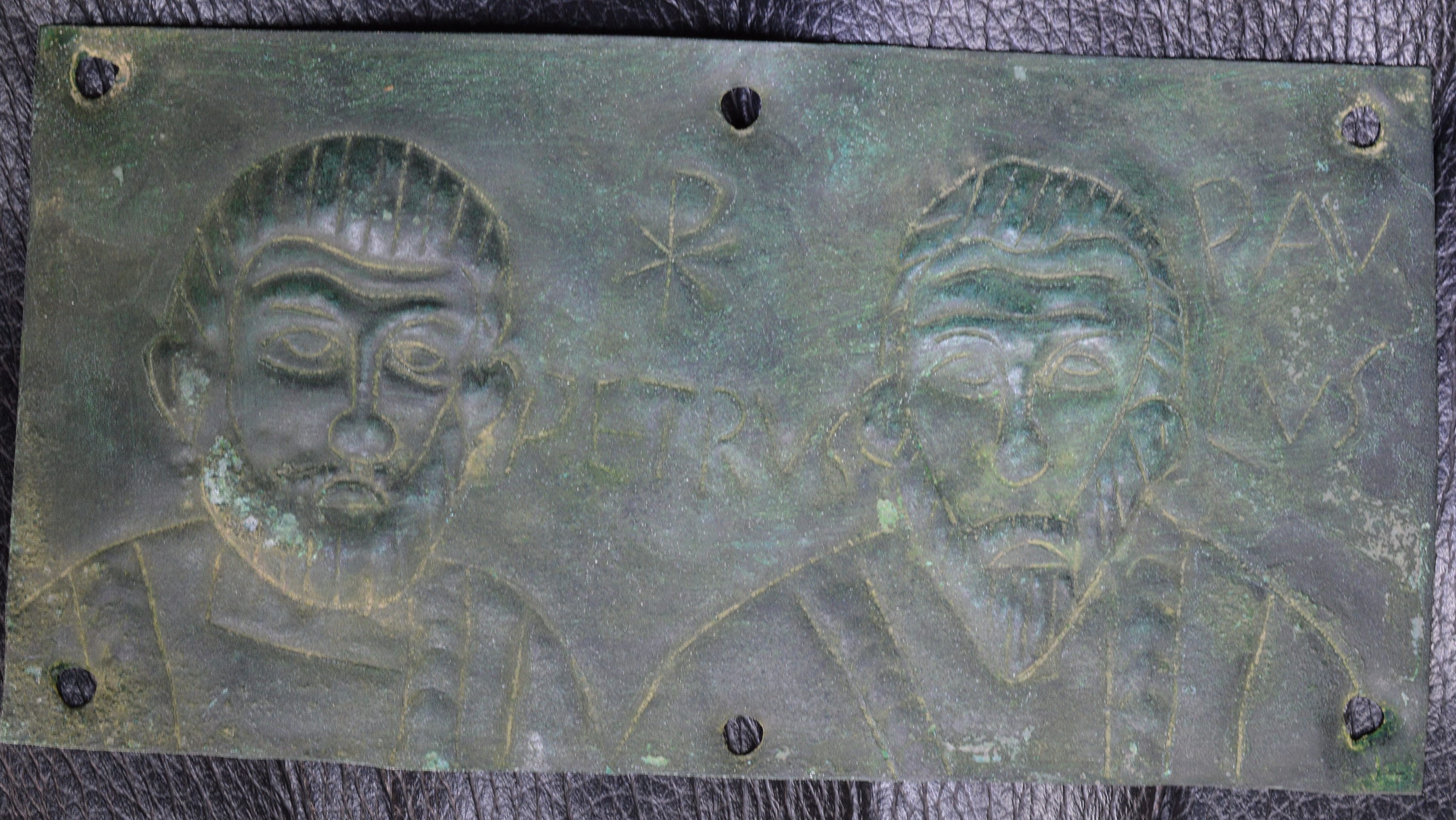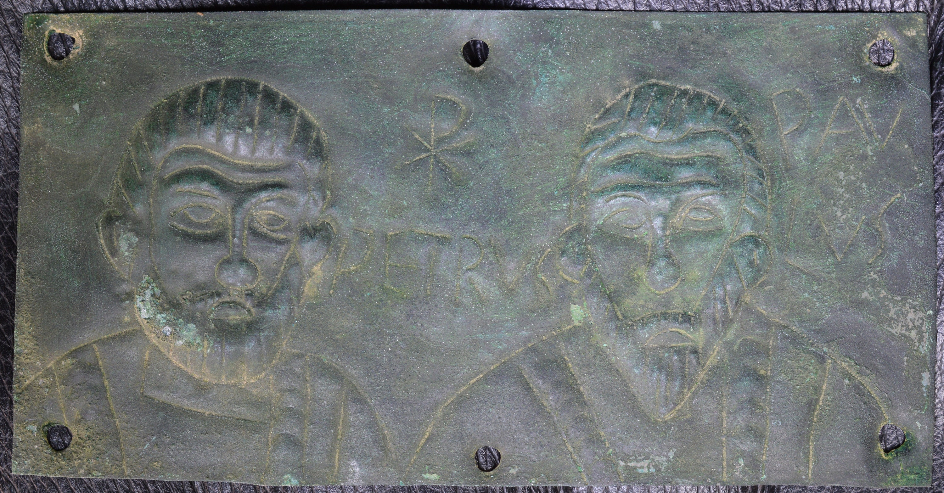 Byzantine Bronze Icon Attachment PETRVS & PAVLVS, Chi-Rho Symbol