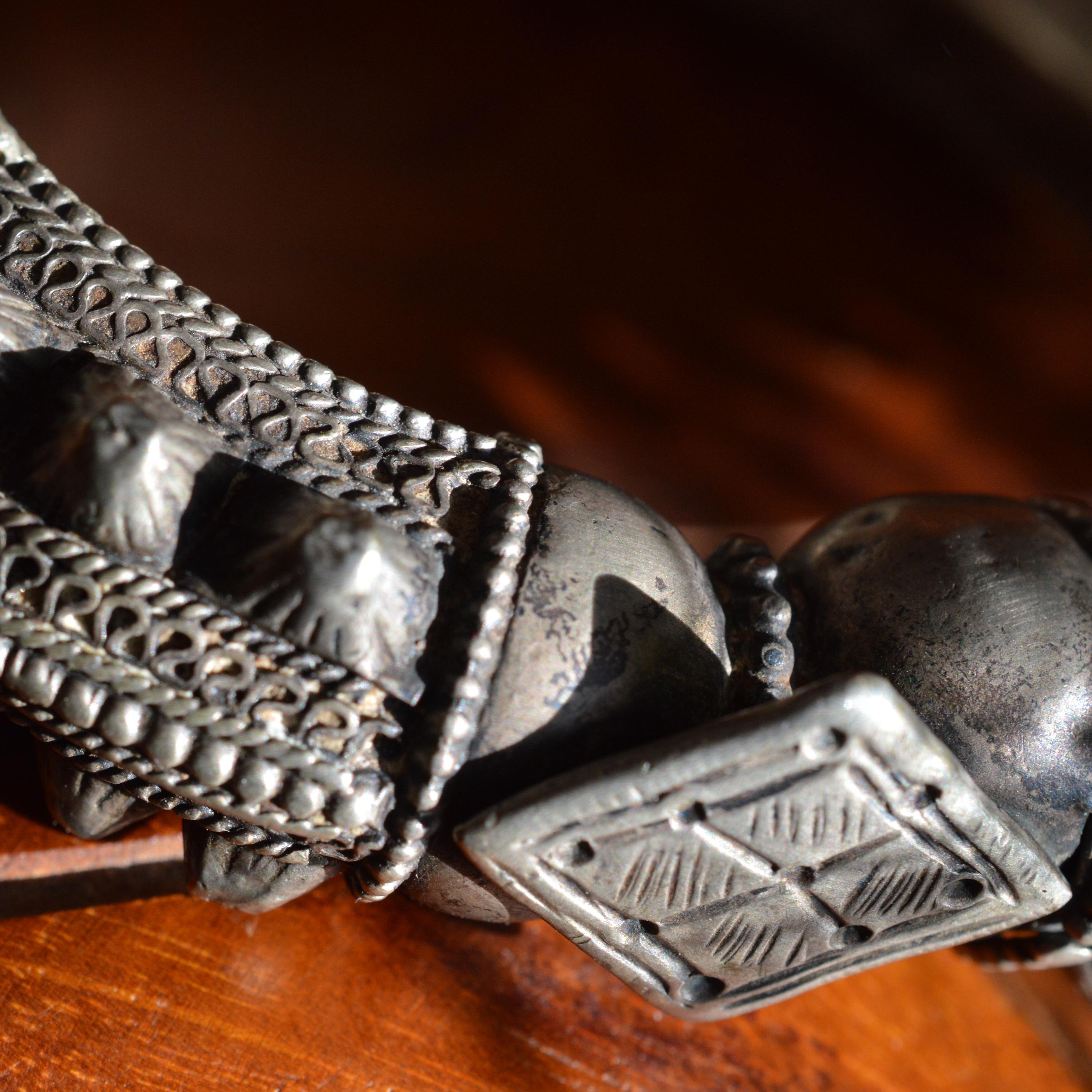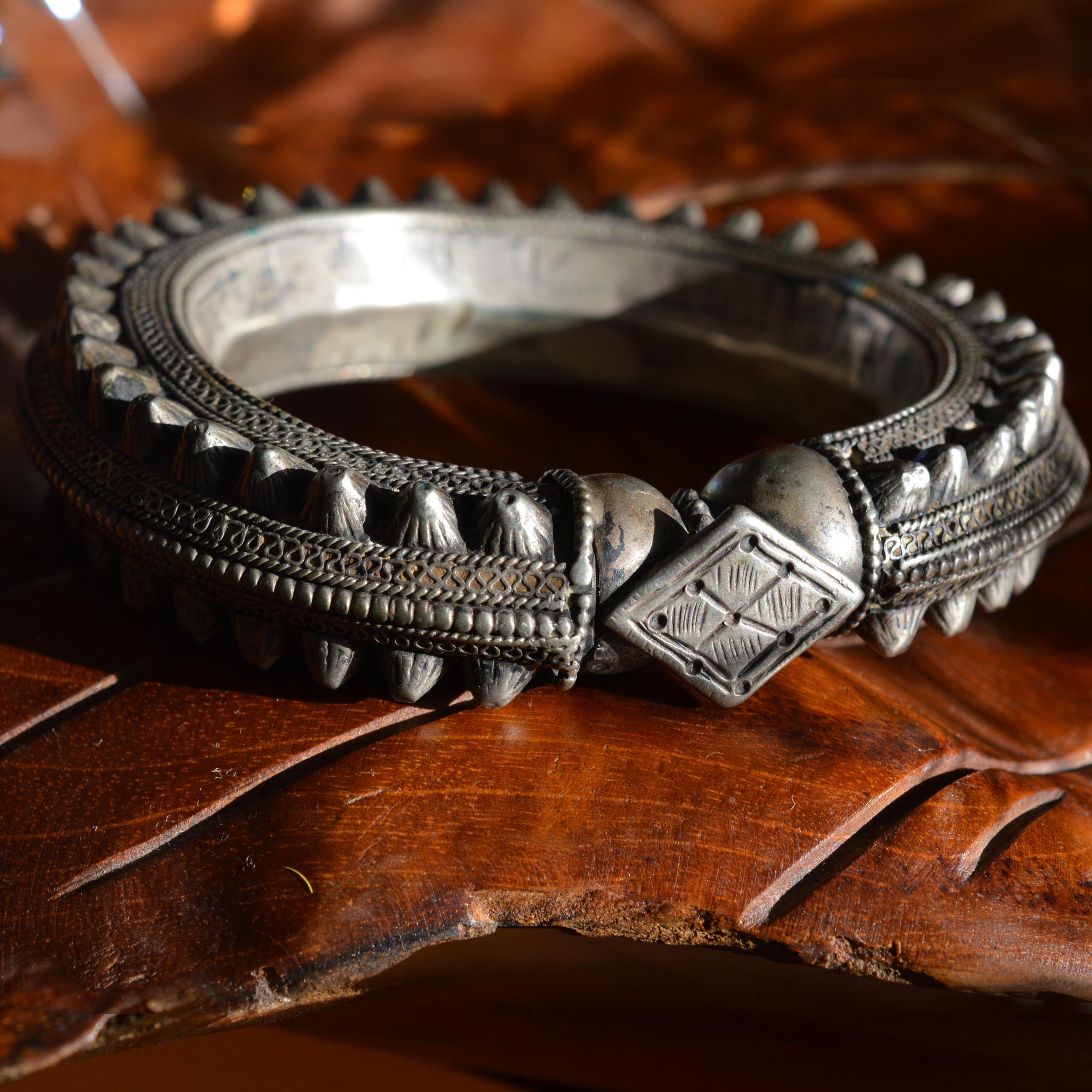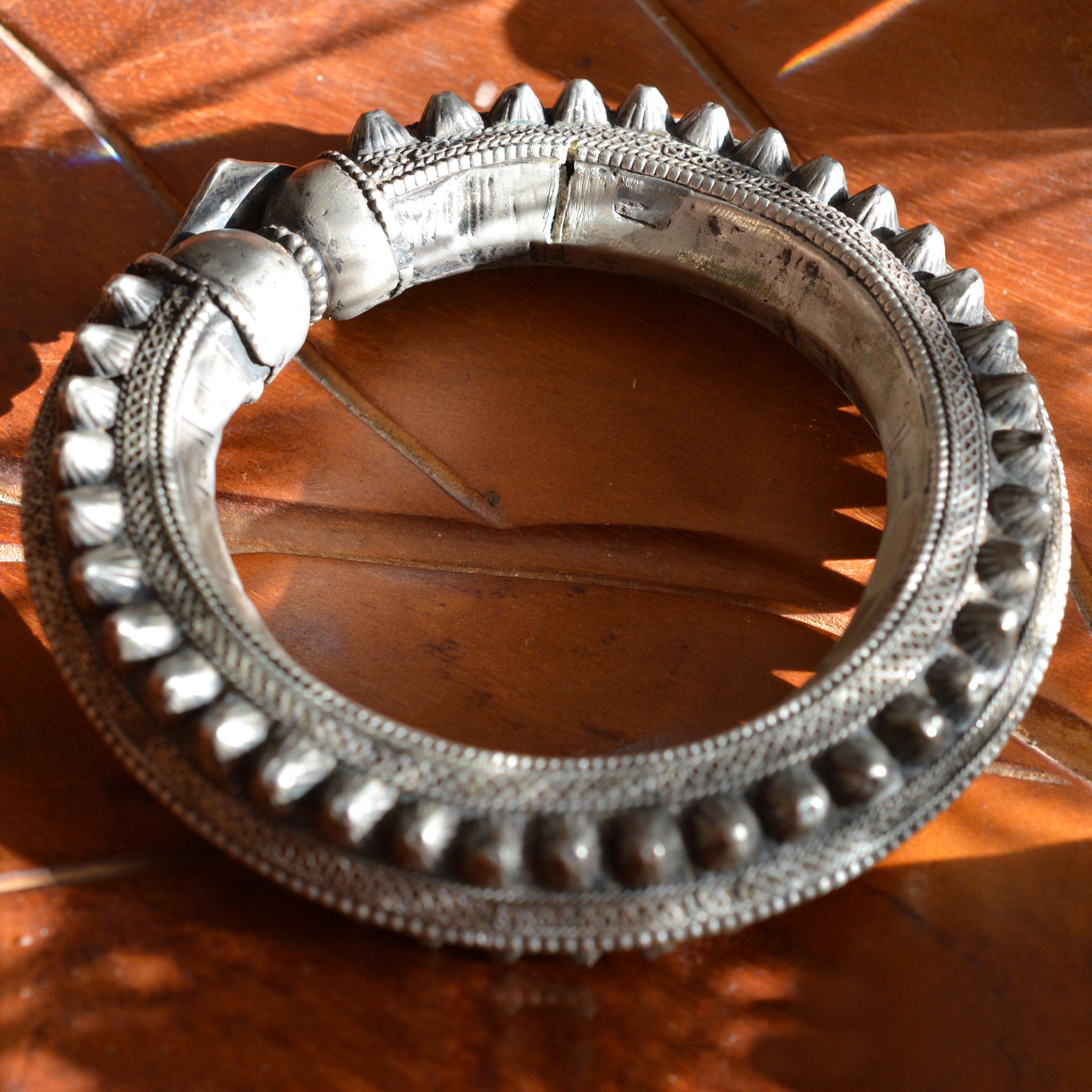 An extremely fine and heavy Roman civilization solid silver bangle composed of a circular, plain hoop, featuring finely decorated terminals, modeled as beast heads.